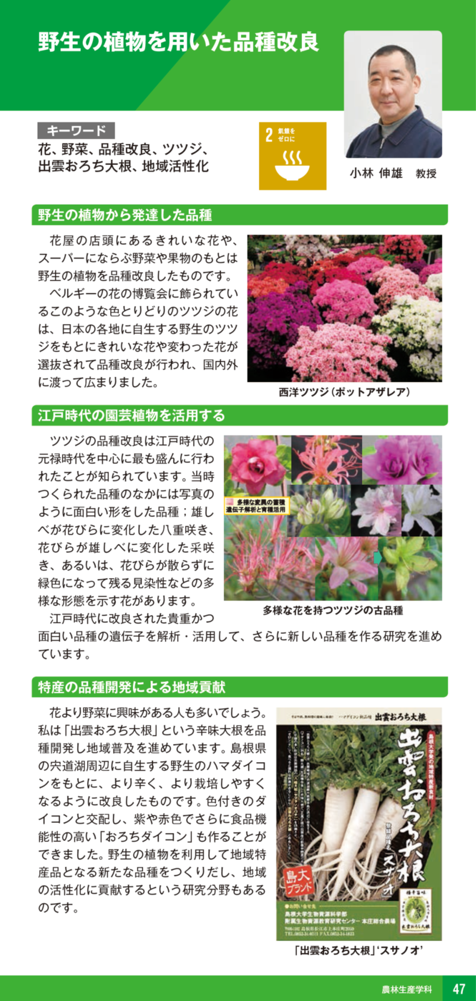 ツツジを中心に園 芸植物の品種改良、地域特産の植物遺伝資源の評価と利用などの研究を行っています。「出雲おろち大根」のような新品種を一緒に育成しましょう。