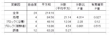 分散分析の結果から入浴剤間には有意水準5%で有意差があると判定できました.さらに浴槽のブロックは5%水準では有意差はありませんでしたが,誤差よりも大きな分散であり,浴槽をブロックにして,誤差を減少できたことがわかります.一方,被験者のブロックによる変動は誤差と同じくらいの大きさしかありませんので,被験者の違いはブロック因子にするほどの変動をもたらすものではないことがわかりました.