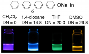 OH基をもつオリゴフェニレン類を、有機溶媒中でアルカリ処理してOH基をONa基としたときの吸収と蛍光発光の波長が、溶媒のドナー数(DN)が増大するにつれてレッドシフトすることを見いだしました。例えば、オリゴフェニレン(6)のOH基をONa基とすると、ジクロロメタン (DN = 0)中では紫色、1,4-ジオキサン (DN = 14.8)中では青色、THF (DN = 20.0)中では緑色、DMSO (DN = 29.8)中では橙色に発光します。水酸基をもつ様々なオリゴフェニレン類やポリフェニレン類およびナノカーボンを合成して、新しいソルバトクロミック材料の開発に関する研究を進めています。