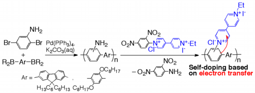 π共役高分子は、ドーピングすると電気的・光学的・磁気的性質が激変することが多く、様々な分野で応用が行われています。本研究室では、電子受容性に優れるビオロゲンユニットをドーパントとしてp型π共役高分子中に組み込むことに基づく、外部環境の影響を受けにくい新しいp-ドーピング法を開発しました。この方法を利用して、自己p-ドープ型のポリパラフェニレン類、ポリアニリン、ポリピロール、ポリアセチレン類を合成することができました。