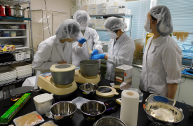 食品開発研究室では、調理や加工方法の違いが、その品質および健康機能性に及ぼす影響について研究しています。食品の調理・加工、食品の品質評価(香り、テクスチャー)、官能評価、機能性評価(抗酸化性、成分分析)など、多くのことを学び、食品開発に必要な技術・技能を養います。そのために必要な設備、装置、器具類がそろっています。