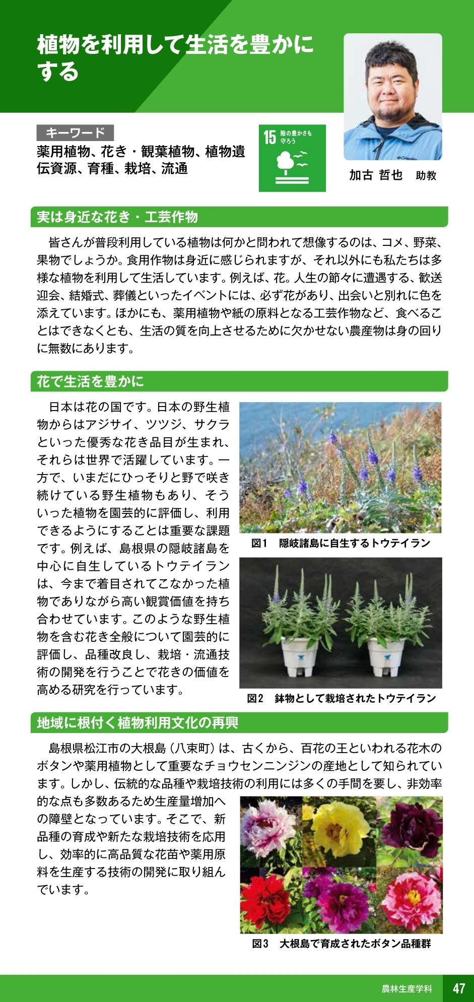 Research is conducted on horticultural crops, with a focus on ornamental and medicinal plants, breeding and development of production technologies to utilize these resources. In particular, for potted ornamentals, research is being carried out on flower production processes including the evaluation of native species, breeding, growing methods, control of shipping periods, and the preservation of quality.