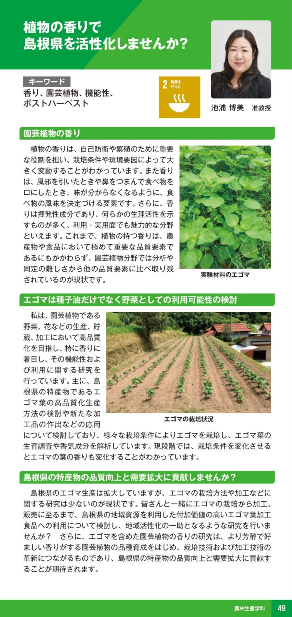 植物における香りは、防御や種子繁殖のための役割を担っています。野菜や果樹など青果物や食品として加工したものにおける香りは、風味としてなくてはならないものになります。そこで、野菜、花卉、果樹などの生産,貯蔵、加工における品質,特に二次代謝物質である香りに着目し、その機能性および利用に関する研究を行い、島根県の特産物へ貢献できるように心がけていきます。