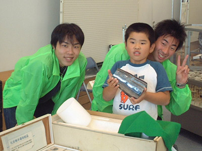 青少年のための科学の祭典は夏の「出雲大会」に引き続いて,秋の「島根大会」が開催されました。11月1日が3,000人,2日が5,000人の来場者があったそうで,両日とも大にぎわいでした。ユニフォームは蛍光グリーン。このメンバーにはどうかと思いましたが,意外と似合うものですね。