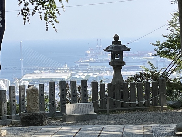 東六甲・金鳥山の中腹,保久良山頂に鎮座する神社。標高185mに位置し,神戸の街並みを一望できる絶景神社として知られる。御祭神は須佐之男命,大歳御祖神,大国主命,椎根津彦命。境内の石灯籠は「灘の一ツ火」として有名で,1825年から沖を行く船人の道標となり,海の安全を見守ってきた。