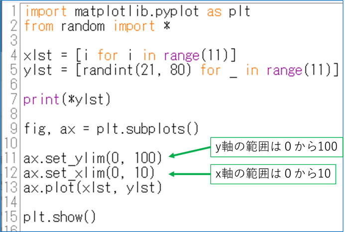 matplotlib ではグラフに描画する座標データに応じて縦軸と横軸の数値を自動で割り当ててくれます.自分で値を固定値にすることも可能です.