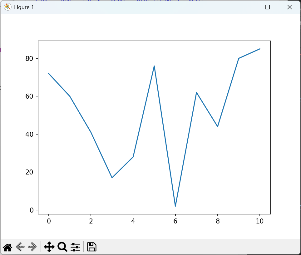 import matplotlib.pyplot as plt from random import * xlst = [i for i in range(11)] ylst = [randint(1, 100) for _ in range(11)] print(*ylst) fig, ax = plt.subplots() ax.plot(xlst, ylst) plt.show() |