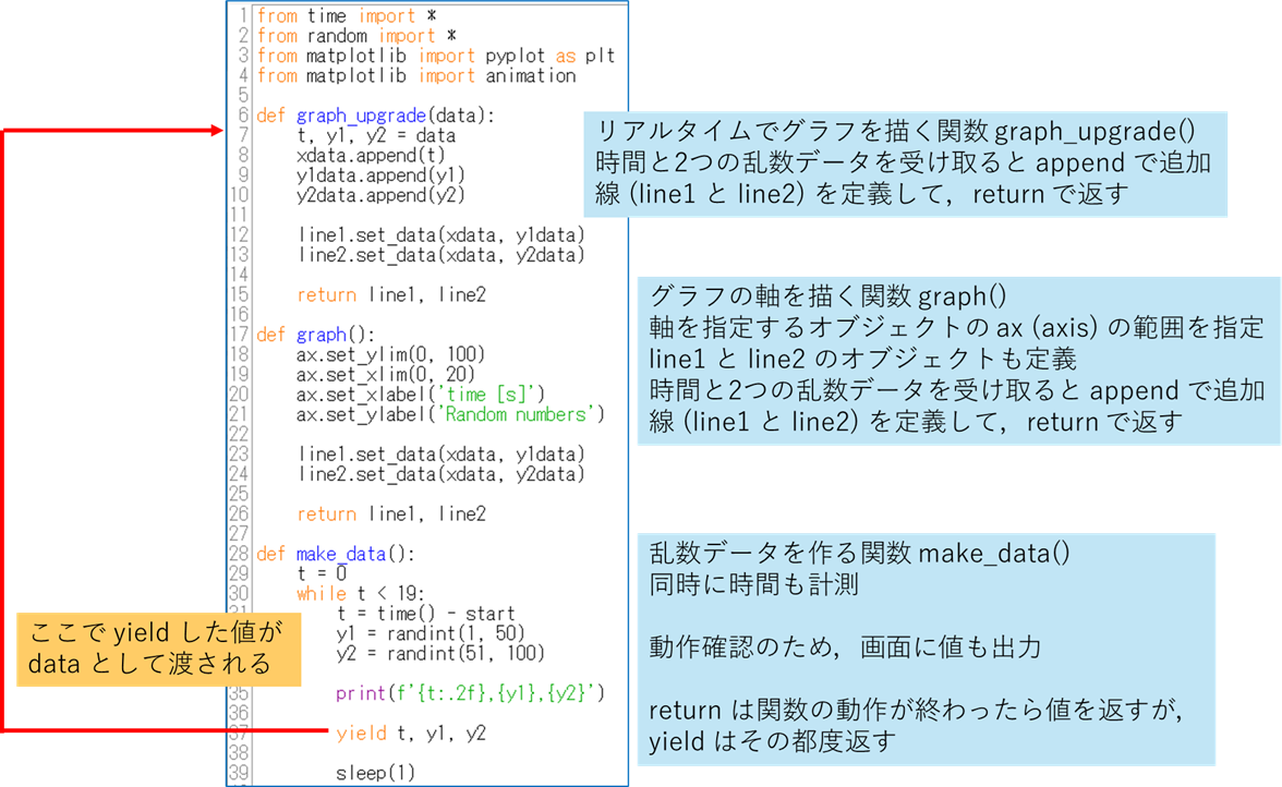 本日の最後の取り組みはリアルタイムでグラフを表示するものです.データ計測においては必須の機能ということになります.while 文の中で乱数を発生させ,その都度グラフに描画するということを試してみましょう.matplotlib の animation 機能を使用します.