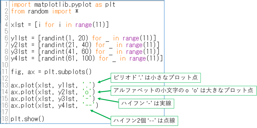 まず import 文ですが,numpy は略称として np を使用し,matplotlib は plt を使うということがお約束ですので,そこは勝手な名前にはしないでください.その他の説明は下図のようになります.