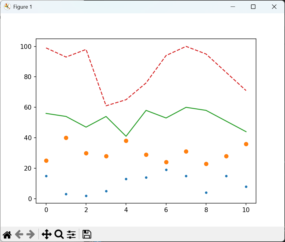 import matplotlib.pyplot as plt from random import * xlst = [i for i in range(11)] y1lst = [randint(1, 20) for _ in range(11)] y2lst = [randint(21, 40) for _ in range(11)] y3lst = [randint(41, 60) for _ in range(11)] y4lst = [randint(61, 100) for _ in range(11)] fig, ax = plt.subplots() ax.plot(xlst, y1lst, '.') ax.plot(xlst, y2lst, 'o') ax.plot(xlst, y3lst, '-') ax.plot(xlst, y4lst, '--') plt.show() |