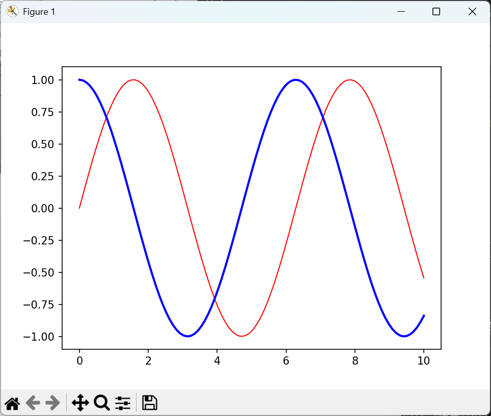 import numpy as np import matplotlib.pyplot as plt x = np.linspace(0, 10, 100) fig, ax = plt.subplots() ax.plot(x, np.sin(x), color='r', linewidth=1) ax.plot(x, np.cos(x), color='b', linewidth=2) plt.show() |