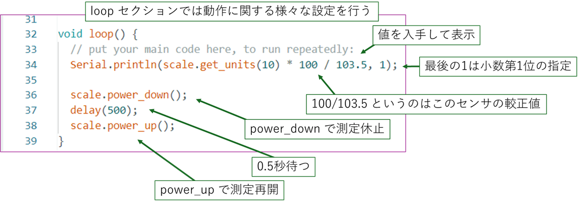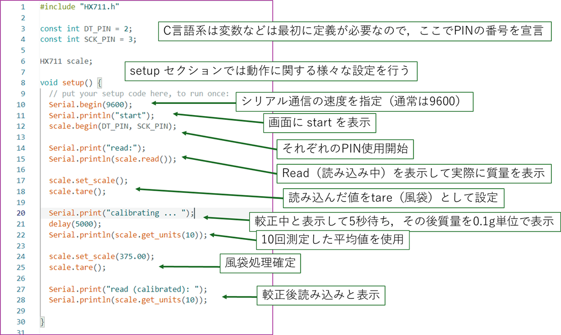 HX711は Arduino IDE でライブラリを読み込むことで必要な機能を使用できます.今回は以下のプログラムでまずは質量計測ができるようにしてみましょう.