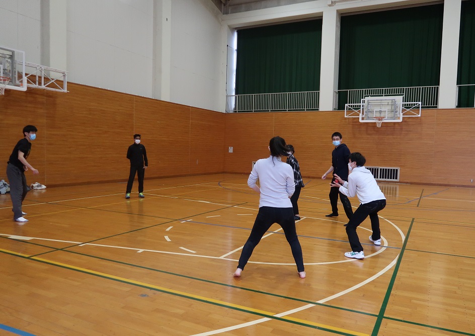 サロンでは、まず当研究所の田中研究員から今回のテーマとルールについて説明があり、その後、4名ずつのチームに分かれて対戦を行いました。中国式ドッヂボールは攻守固定制で、3分で攻撃・守備を交代します。守備のチームは、中央の決められた枠の中でしか自由に動くことができず、攻撃のチームは、その枠の外から相手の選手を狙って沙包を投げます。3分間は意外に長く、枠の中で沙包をよけながら動くことは、いい運動になりました。ルールが複雑でないこともあって、学生たちもそれぞれ楽しんでいる様子で、スポーツは万国共通のレクリエーションであることを再認識しました。