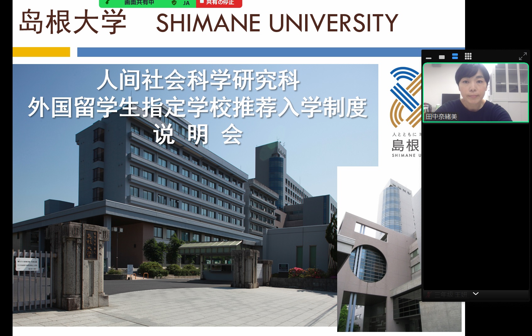 11月26日(火)、寧夏大学で日本語を勉強する学生に対して、指定校推薦留学制度に関する説明会をオンラインで開催しました。島根大学人間社会科学研究科と寧夏大学外国語学院は指定校推薦制度に関する覚書を交わしており、寧夏大学外国語学院を卒業した学生は、当該制度を利用して人間社会科学研究科の修士課程に留学することができます。今回の説明会は、日本語科の3~4年生を対象に行われ、3年生8名、4年生9名の計17名が参加しました。