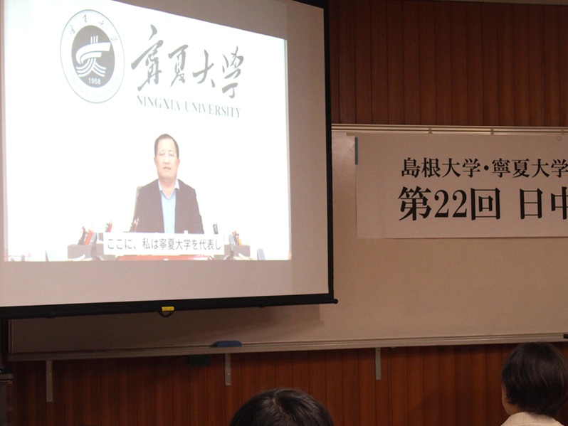 18日(土)は、開会式と基調報告を行いました。開会式では、島根大学の片岡佳美グローバル化推進担当副学長による歓迎の挨拶に次いで、寧夏大学の楊文法副校長からいただいたビデオメッセージが放映されました。