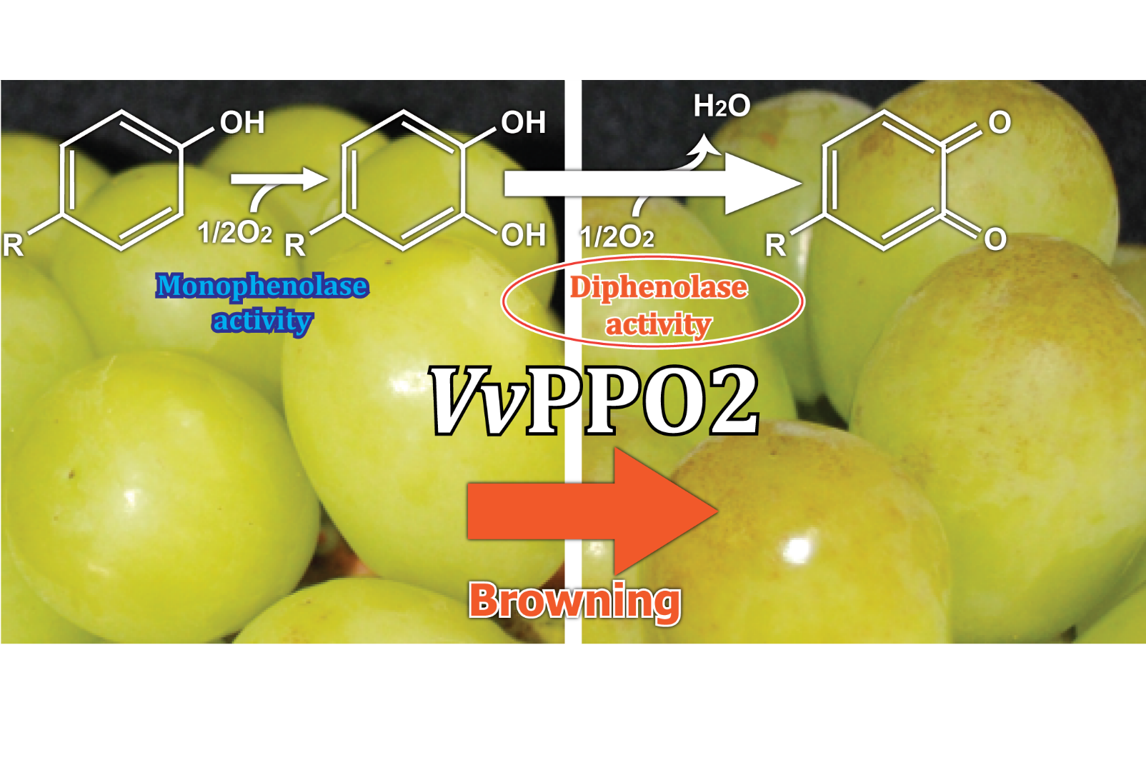 人気品種'シャインマスカット’をはじめとしたブドウの果実(果粒)の成熟について研究を進めています。'シャインマスカット’の生産では収穫前に果実表面に”茶色いそばかす”が生じ、商品の見た目が悪くなる問題もあります。”茶色いそばかす”の正体は一体何か、なぜそばかすが生じるのか、ブドウ果実におけるポリフェノール類の蓄積やポリフェノール酸化酵素の働きについて、石川県立大学や島根県農業技術センターの研究者と共同で研究を行っています。