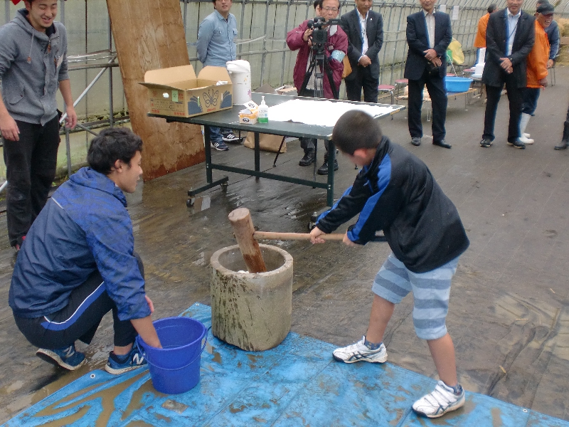 コンテスト開催の協力は、4年生の卒業研究ならびに2年生の通年科目(農村調査分析論)の現地調査も兼ねており(アンケート調査、参与観察)、当日の準備、お餅つき、水風船すくい、後片付けを、夢ファーム延命の里の皆様と一緒に行いました。